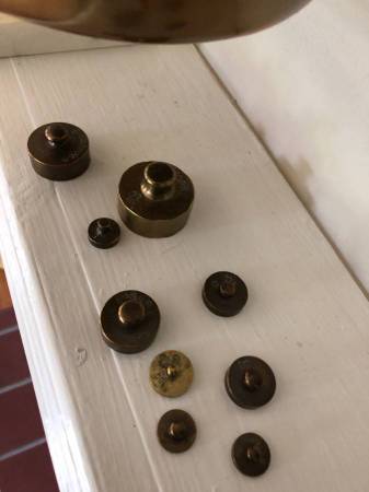 English Alabaster and solid brass scale with original weights. Very nice . REDUCED TO 225.00. No Text. Phone *9*3*7*2*9*8*0*3*1*4*