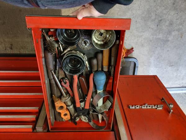 Retired years of mechanic tools and gauges. Sockets pliers scanners hammers screw drivers hoses clamps torpedo heaters very large snap on roll around tool box cabinets storage wall cabinets over 60 years retired so selling everything pieces or all of it call or text show contact info