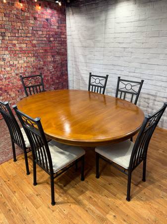 This dining table comes with one leaf and seven chairs. The table and chairs have a few bumps and bruises, but overall it’s in decent condition.
