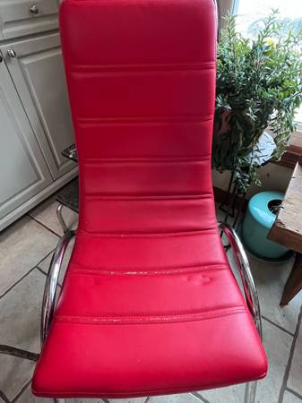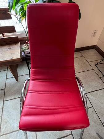 Tempered glass table with second tier and 4 chairs. Glass has no chips and in excellent condition. Chairs could use reupholster .. see photos. Table is 43”L x 28 1/2H. Chairs are 18” W x 35 1/2H....