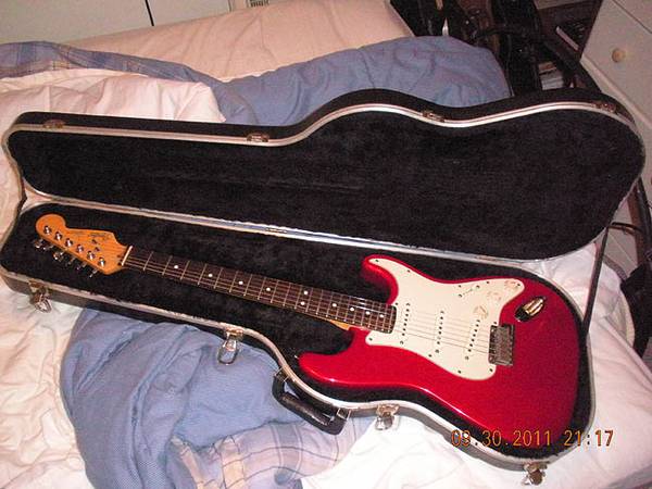 1989 Fender American Standard Stratocaster, Fire Engine Red Lite Sparkle with hard case. VG original condition.